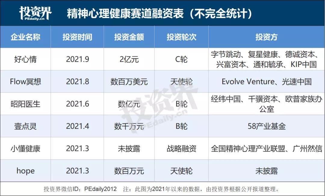 松果门诊,拍摄于2020年11月 至此,字节跳动的医疗版图开始浮出水面。天眼查显示,北京松果门诊部有限公司由北京松果医疗有限公司100%持有,后者的全资母公司是“北京极光半径科技有限公司”,该公司的法定代表人是为孙雯玉;更深一层的股权穿透信息则显示,极光半径由幺零贰四科技100%持有,后者的疑似实际控制人是吴海锋。 吴海锋和孙雯玉,其实是字节跳动在医疗行业布局的关键人物之二。事情还要从2019年5月说起,在那一波百度高管离职潮中,原百度副总裁吴海锋、原百度执行总监孙雯玉离职,此后二人共同创办了幺零贰四。2020年8月,字节跳动将幺零贰四整体收购并进,由此将吴海锋和孙雯玉收入麾下。 很快,字节跳动成立了专门负责大健康业务的极光部门,正是由吴海锋带队,负责医疗信息和互联网医疗。当时,吴海锋直接向还未卸任字节跳动全球CEO的张一鸣汇报,在今年5月张一鸣卸任后,尚不知吴海锋是否要向新任CEO梁汝波汇报。 2020年11月,字节跳动完成了对医疗健康业务的首次品牌确认,推出了“小荷医疗”的独立品牌,并发布了小荷App(面向患者)和小荷医生App(面向医生)。 看似珊珊来迟,但字节跳动早已经火力全开。去年8月,字节跳动完成对医学科普知识平台百科名医网的全资收购,后者是国内最大的专业医学科普知识内容平台,同时也是“国家卫健委权威医学科普项目”唯一指定网站。据悉,这笔5亿元的收购案也是由吴海锋主导的。 此外,字节跳动在2016年成立的AI Lab(人工智能实验室),于去年年底开始在北京、上海、美国三地招揽AI制药领域人才。 如今看来,幺零贰四是一个互联网+大健康的内容服务平台,意图于通过人工智能、云计算、大数据等技术打造医疗健康内容服务平台,提供医疗健康信息和服务;松果门诊的一步棋,意味着字节跳动在医疗领域祭出了一套线上+线下的组合拳。现在,字节又投资了好心情,将触角伸向了精神健康一隅。 03心理健康,2.5亿人撑起一个蓝海赛道融资潮开始来了你可能不知道,心理健康这个冷门赛道开始火爆起来。 这是摆在当下年轻人眼前的一座大山。热播剧《我在他乡挺好的》中的晶晶患有微笑抑郁症,最后结局令人扼腕。一组数据更加残酷:目前我国各类精神心理疾病总体发病率为17.5%,精神心理疾病发病人群和医疗服务需求人数达2.5亿人,而临床精神科心理科的执业医师仅4.5万名左右。每10万人平均拥有精神科医师尚不足国际标准的1/4,资源严重短缺。 而据《全国精神卫生工作计划(2015-2020)》分析,我国精神科医疗资源主要分布在省级和地级市。精神卫生供给不充足,也不均衡。常见的精神心理疾病包括抑郁症、焦虑症、强迫症,其中,抑郁和焦虑症发病率最高,发病率达7%以上,是精神科门诊中占比最大的病种。近年来,精神和心理疾病发病率一直在攀升。 最近还有一个话题在年轻人中流行:中国有超3亿人存在睡眠问题。而睡眠不足可能会增加患焦虑、抑郁的风险。同时,焦虑、抑郁等心理疾病也会造成严重的睡眠问题。 重视心理健康,刻不容缓。不久前,全国卫生大会上提出了“要加大心理健康问题基础性研究,做好心理健康知识和心理疾病科普工作,规范发展心理治疗、心理咨询等心理健康服务”的方针。 卫健委等八个国家部委还联合发布《关于印发全国社会心理服务体系建设试点2021年重点工作任务的通知》,要求辖区100%精神专科医院设立心理门诊,40%的二级以上综合医院开设精神(心理)科门诊,提升医疗机构心理健康服务能力。 与此同时,民营精神心理医院开始崛起,填补公立医院资源不足的问题。据不完全统计,2020年开始,心理健康领域共发生近60起融资事件,累计融资超10亿美元。仅2021年至今,包括Flow冥想、壹点灵、小懂健康、hope.....相继完成融资,背后投资方不乏经纬中国、复星健康、德诚资本、通和毓承、KIP中国、荷塘创投等VC/PE机构。