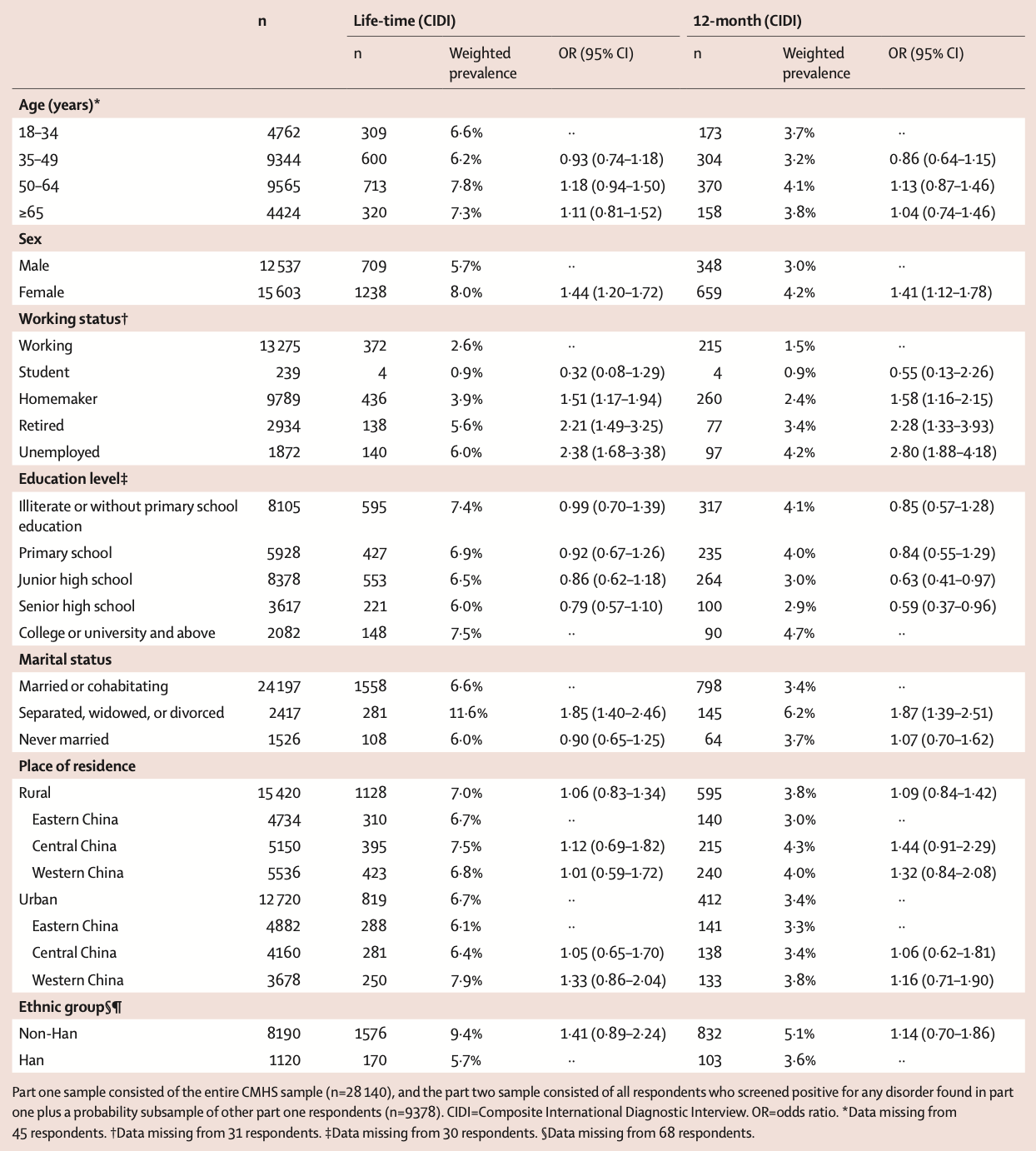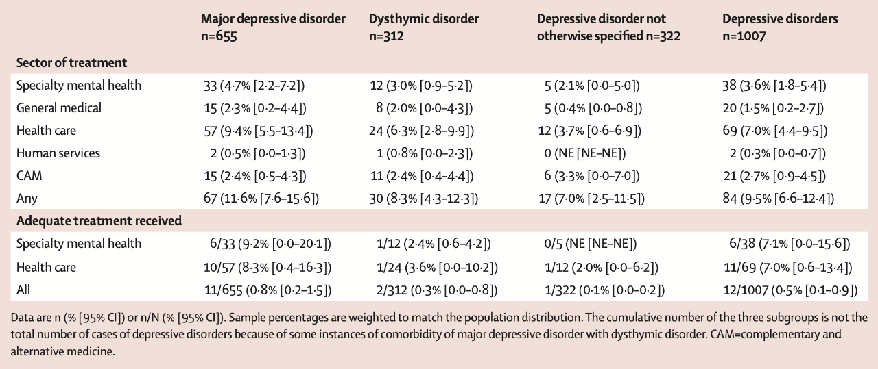 中国成人抑郁障碍终生患病率高达6.8%中国的抑郁障碍疾病负担是那么高,患者是那么多,然而,很长一段时期以来,缺乏具有全国代表性的抑郁障碍流行病学数据。 因此,有关部门只能通过数学模型估算的方式,规划相关政策,而这存在极大的误差与不确定性。 改变由这个调查开始。 由北京大学中国社会科学调查中心培训合格的824名访谈员,开展本项目的入户访谈,确认受访者在一生中或近12个月内是否存在满足《精神疾病的诊断和统计手册》诊断标准的抑郁障碍,包括抑郁症(MDD)、恶劣心境、抑郁障碍未特定(NOS)三种亚型。 受访者分为18-34岁、35-49岁、50-64岁、≥65岁四组,治疗方式被分为精神心理专科治疗、综合科室治疗、人类社会服务(如院外宗教人士、社工等提供的干预)、补充与替代治疗(CAM)四类。 对于近12个月内存在抑郁障碍的受访者,遵医嘱使用任何抗抑郁药或心境稳定剂治疗≥30天且≥4次,或在精神卫生医疗机构接受≥8次心理治疗(每次平均30分钟),被视为「充分的治疗」;人类社会服务及补充与替代治疗,均被视为不充分的治疗。