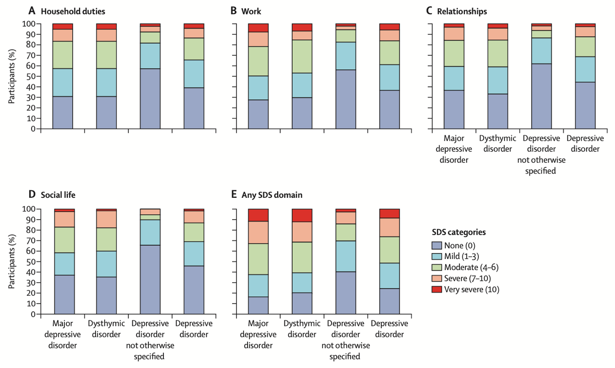 抑郁障碍患者社会功能受损明显得到充分治疗不足1%研究结果还显示,大多数抑郁障碍患者均存在明显社会功能损害。 在过去12月被诊断为抑郁障碍的744名患者中,75.9%存在功能损害,其中抑郁症的功能损害占比83.6%,心境恶劣障碍的功能损害占比79.8%,未特定型抑郁障碍的功能损害占比59.9%。