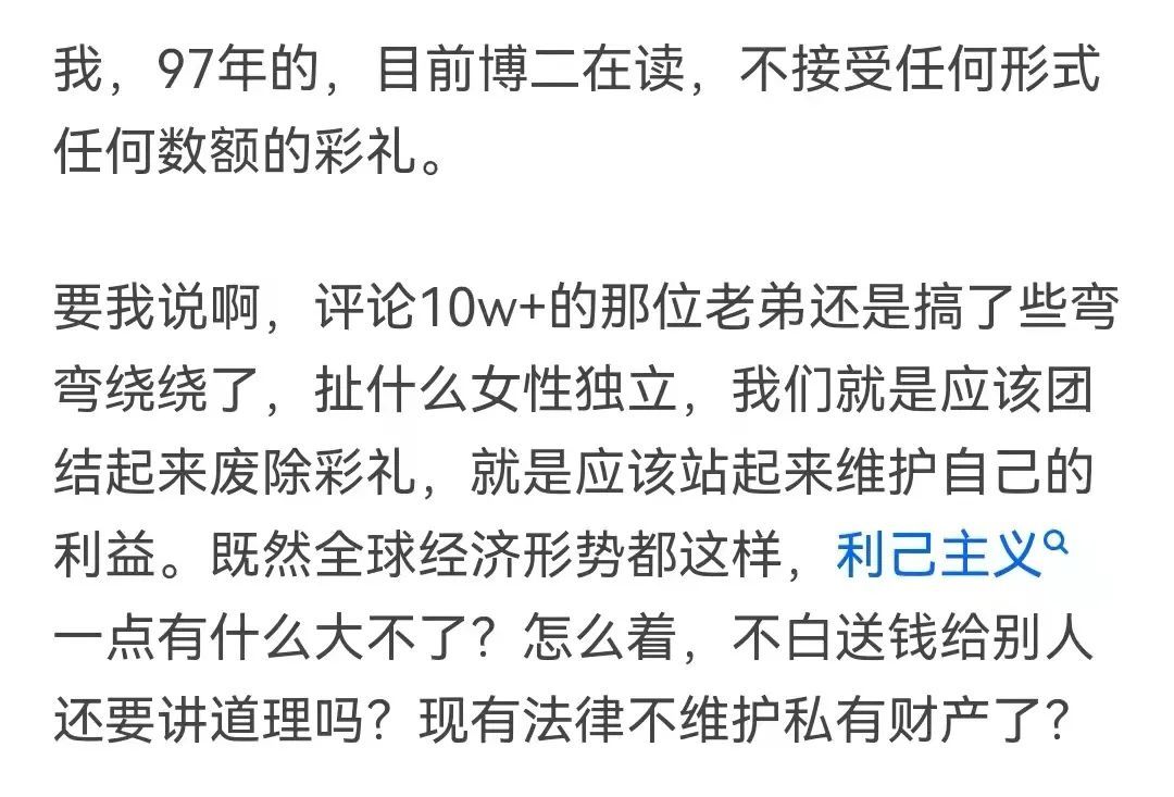 一位自称在读博二的97年男生说:“我们就应该团结起来废除彩礼,维护自己的利益。不白送钱给别人还要讲道理吗?”