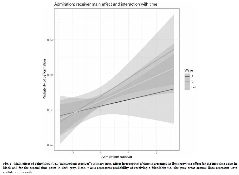 图1 在初始时间点1和三个月后时间点2 自恋钦佩对受欢迎的影响