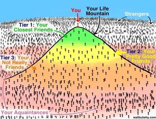 在橙色区域的山脚下,是你的第3级朋友——算不上真正的朋友。当你搬到他们所在的城市时,你可能会和他们中的某个人一对一地喝一杯,但是5年过去了,都没有相约喝过第二杯的话,你们两个都不会感到惊讶。你的关系往往作为某个更大的群体的一部分,或者通过偶尔的社交软件互赞之类的存在,当你听说其中一个人去年赚了500万美元时,你甚至不会感到压力。