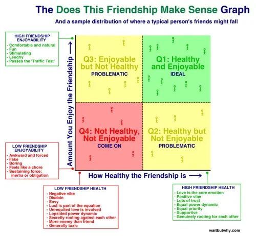 随着时间的推移,我们大多数人在2-4象限中的朋友往往会越来越少,因为A)人们逐渐成熟,B)随着年龄的增长,人们对自己要唯一的关系持有更自信且更高的标准。