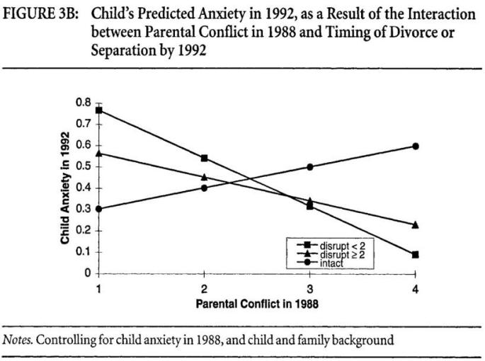 青少年并非对父母争吵这件事不敏感,一项Mechanic和Hansell(1989)的纵向研究中,青少年报告的家庭冲突(包括父母、兄弟姐妹和亲子冲突)与他们随时间增长的焦虑有关(相关系数r = 0.53)。Jekielek(1998)指出婚姻冲突和父母离婚都会预测儿童未来发展出的焦虑,离婚的影响会随着时间消逝,但若是不离婚,让孩子持续暴露在高冲突的环境里,他们的焦虑水平也会随时间保持。