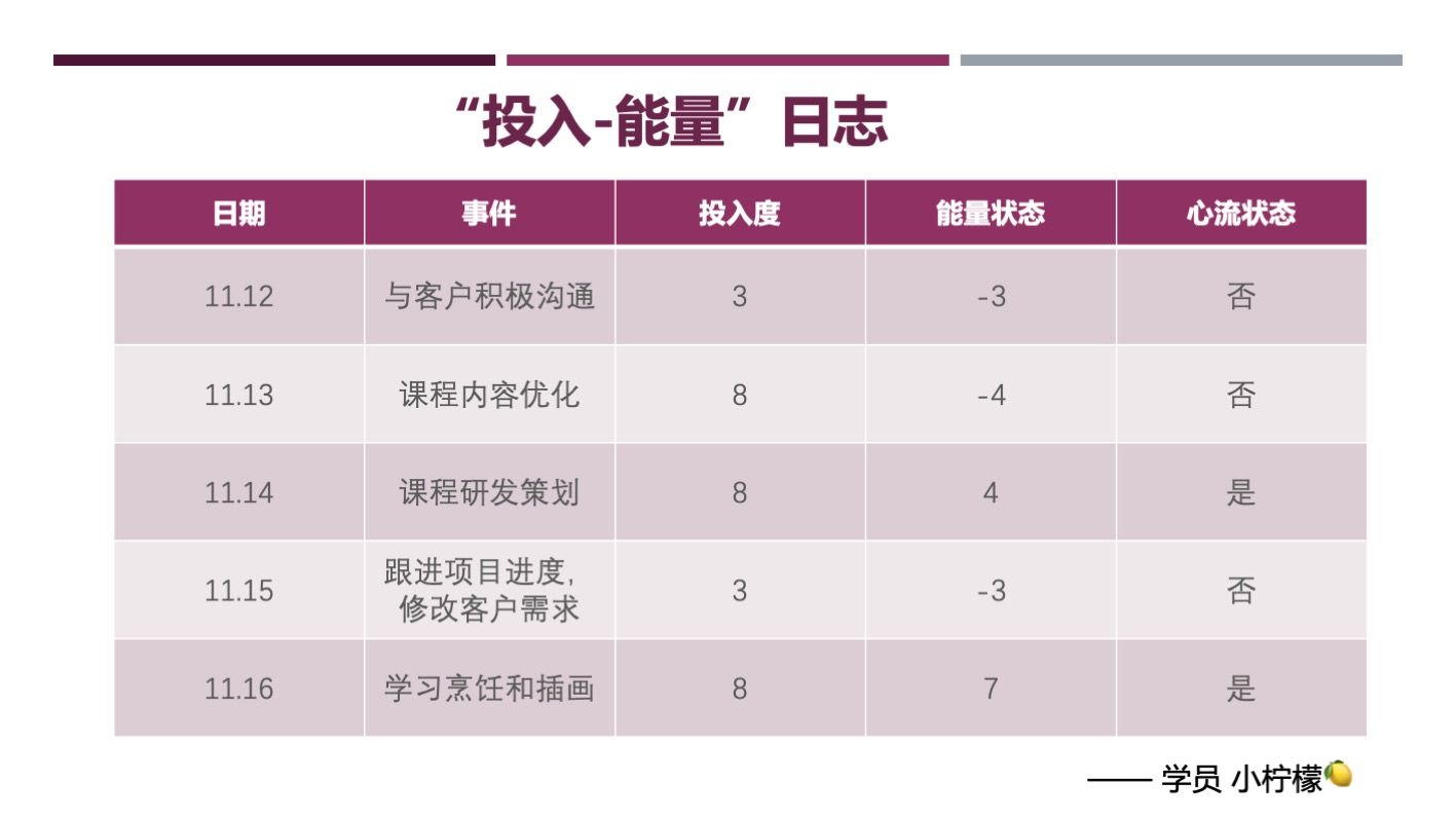 以我的一位学员的“投入-能量”日志为例,她通过记录“投入-能量”日志的方法慢慢探索出了自己在职业中的热情。