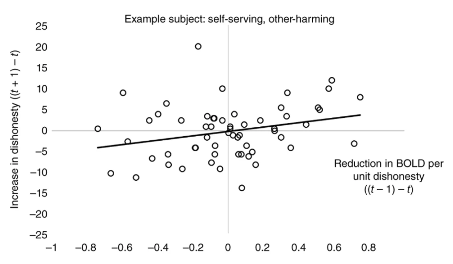 ▲ 大脑对不诚实反应的减少可以预测不诚实程度的升级虽然很多时候我们觉得,自己撒的只是小慌,甚至于是一个对彼此都有好处的谎言,但不可否认的是,这种习惯会蔓延到其他的事件里,等到事情真正事关利益时,为了自己的好处,你也会不自觉撒谎,那时候,就很难说是不是 “善意” 了。