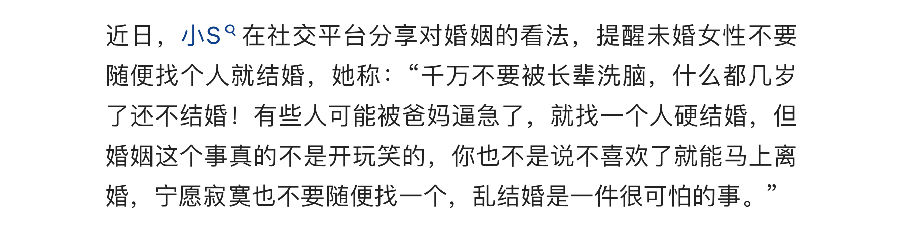 前段时间,小S在播客节目中谈到了结婚话题,她提醒未婚女性不要被长辈洗脑,或因年龄焦虑找个人硬结婚,更不能害怕寂寞随便结婚,因为乱结婚是一件很可怕的事。 我们看到,43岁的小S分享的婚姻观,对于未婚女性来说,是很有助益的。 其实,从她谈论的这个“乱结婚”角度,我们可以分析出,什么才是正确的结婚态度。 今天的文章,我们就来说说,正确的结婚态度,应该是怎样的。