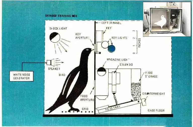 没过多久,斯金纳就发现聪明的鸽子学会了通过啄红点去获得食物。 斯金纳认为,鸽子在“啄红点”(刺激)和“获得食物”(结果)中建立了一种联结。这种联结使得鸽子相信,只要去啄红点,就可以获得食物,从而增加了鸽子去啄红点的频率。 接着,斯金纳对实验进行了一些小小的改变: 箱子不变,鸽子不变,食物不变,改变的只有提供食物的方式。鸽子不需要通过任何行为获得食物,食物会每隔一段时间被传送过来,只是这个时间是随机且不固定的。