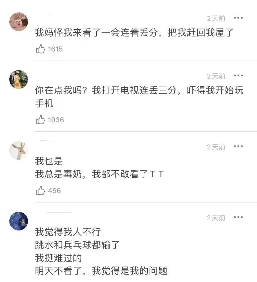 并且,斯金纳还发现,这种迷信行为一旦建立,是很难消除的,且会随着强化间隔变长而更加强烈。 而对于运动员来说,行为和好成绩之间的强化通常需要很久才能发生,反而会导致这些行为持续很长时间。 一些专门针对体育竞技种中运动员迷信行为的研究已经发现,这些 “迷信行为” 实际上真的可以对运动员有所帮助,它们通过减轻压力,增强自信心等方式对运动员们产生了积极的影响。[4] “迷信” 行为并不是一个负面形容,对于艰苦训练多年,背负着压力和期望上阵的运动员们来说可能是一份强有力的安慰剂。 04一看比赛就输:这口“毒奶”我认了除了赛场上的运动员们,观众们其实也表现出了 “迷信” 行为。 乒乓球和跳水接连失误丢分的那天,一众网友纷纷在网络上高呼 “看啥输啥” ,甚至有些网友真情实感地表示自己 “从现在开始只听奥运会” 。