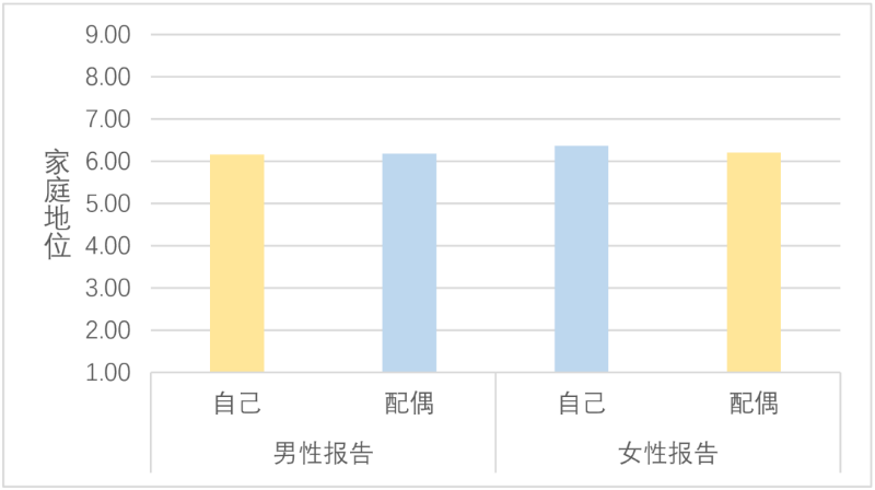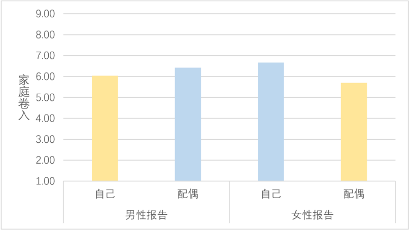 理想的婚姻关系,应该是平等的,是和睦相处、相敬如宾,而不应是你强我弱,分出胜负。我们的团队曾经展开一项面向全国夫妻的调查,结果表明,在家庭地位方面,丈夫们普遍认为自己和配偶的家庭地位没有明显差异,但是妻子们认为自己的家庭地位是高于配偶的;在家庭卷入(对家庭的投入程度)方面,丈夫和妻子都认为妻子对家庭的投入更多,如下图表所示。