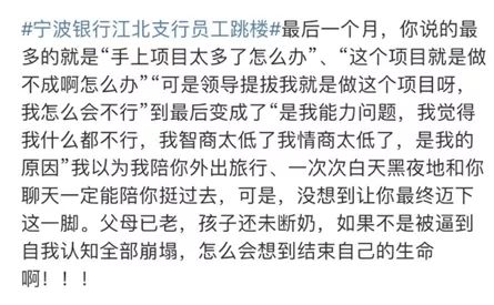 Yamy的事情引起了很多白领的愤怒,感觉在她的身上看到了自己,因为他们就曾遭受过这种直面的打击。 宁波银行员工跳楼事件就是一个活生生的案例。一个本硕连读的厦门大学毕业生,说他没有能力、智商低、情商低?这让谁听都不会信吧。可是他去世之前就是一直在这样否定自己的。 据他的妻子所说,他去世前说的最多的就是“手上项目太多了怎么办”“这个项目就是做不成啊怎么办”“可是领导提拔我就是做这个项目的呀,我怎么会不行”到最后成了“是我能力问题、我觉得我什么都不行,我智商太低了,我情商太低了,是我的问题”。 一个厦门大学本硕生,临走前在迈出最后一步时还在这样贬低自己,可见职场PUA对人的杀伤力是多么巨大啊!