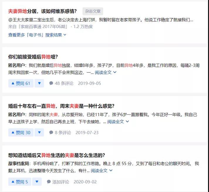 由于工作安排、移民、服兵役等原因,婚姻关系中夫妻异地而居的情况并不少见。 2010年,上海市民政局发布的婚姻状况统计结果显示,2009年上海市民政部门办理国内结婚登记147413对,其中异地婚姻56217对,占总数的近四成。同年中国青年报社会调查中心通过民意中国网和搜狐新闻中心,对3317人进行的一项调查显示,99.5%的人表示身边存在异地婚姻,其中64%的人表示这样的婚姻“很多”。 异地而居的家庭大致上有一些共同的特点:一是夫妻双方共同生活的时间比较少,聚少离多。随着城市发展,现代人生活节奏加快,“周末夫妻”或“月度夫妻”越来越多。夫妻因为工作,分离于城市和城市之间,只有在周末或节假日才有机会相见。 二是如果有孩子,那么和孩子一起生活的一方似乎要担负起大部分的家庭事务责任,尤其是养育孩子的责任。 异地夫妻真的如大部分人所认为的那样,相比夫妻居住在一起的模式维系感情更加艰难,婚姻生活困难重重吗?如果是的话,为什么会出现这种情况呢?异地夫妻又该如何做以维持夫妻感情呢?
