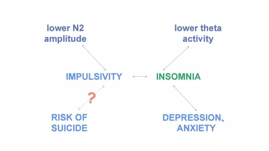 结论:由于CNV与任务开始时的提示(cue)相关,失眠症患者中所表现出的CNV振幅减小反映了他们在任务准备阶段的注意分配功能受损。此外,由于Go/NoGo任务的完成需要抑制性控制(inhibitory control)的参与,在目标指令(target)出现后所观察到的N2振幅的减小以及theta波能量的减弱均表明:失眠症患者的抑制性控制能力受到扰乱。 从脑电活动的指标出发来看的话,有些研究得到了与本研究相似的结果。像是有自杀倾向的被试在Go/NoGo任务中表现出N2振幅的减小,患有抑郁、焦虑的被试表现出theta波能量的减弱。 本研究中也获取了被试在冲动性、抑郁、焦虑量表上的得分,显示与睡眠障碍有相关关系。不过,这些精神机能上的障碍与行为、电生理活动之间的层级因果关系还需要进一步探索