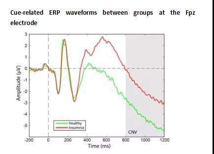 在该任务中统计的行为指标包括:总错误率、在需要注意的方向上出现“x”时(Attend-NoGo)的错误率、在需要注意到的方向上出现“+”时(Attend-Go)作出正确反应的反应速度。任务进行过程中进行EEG信号的记录。 结果行为指标:失眠症患者和无睡眠问题被试在三个行为指标上均无显著差异 脑电指标: 1. 失眠症患者的CNV振幅显著小于正常人