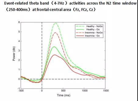 3. 失眠症患者在200-350ms内的theta波能量更低